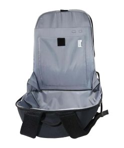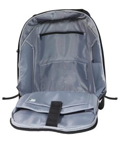 Glidelås til åpning av hovedrom er inn mot rygg. Lomme med glidelås på bakside mot rygg for trygg oppbevaring av verdisaker. Det er også en lomme med glidelås i siden. God polstring og myk mesh i rygg, samt bærestropper. Innvendig er det lyst grått fôr av nylon. Eget rom til bærbar pc opp til 17 tommer.