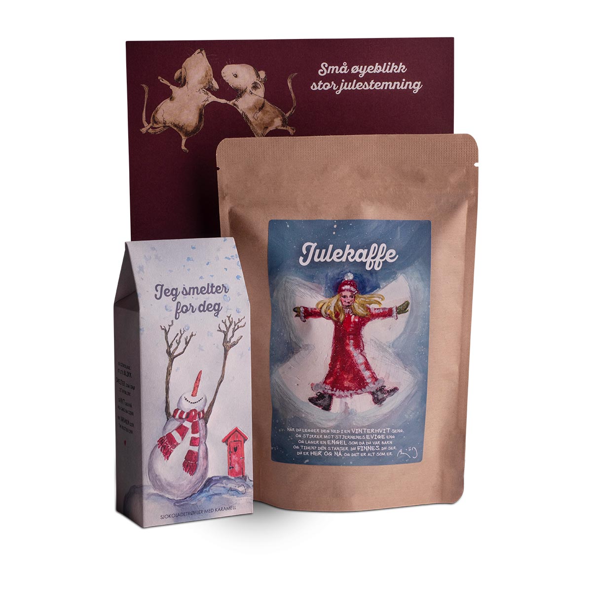 En smakfull gave som varmer både hjerte og sinn. De myke sjokoladetrøflene «Jeg smelter for deg» er rullet i kakaopulver og tilsatt små biter av salt toffee, laget for ekte nytelse. Sammen med Bjørgs Julekaffe, filtermalt kaffe handlet direkte fra kooperativet Othaya i Kenya, blir dette en flott gave.