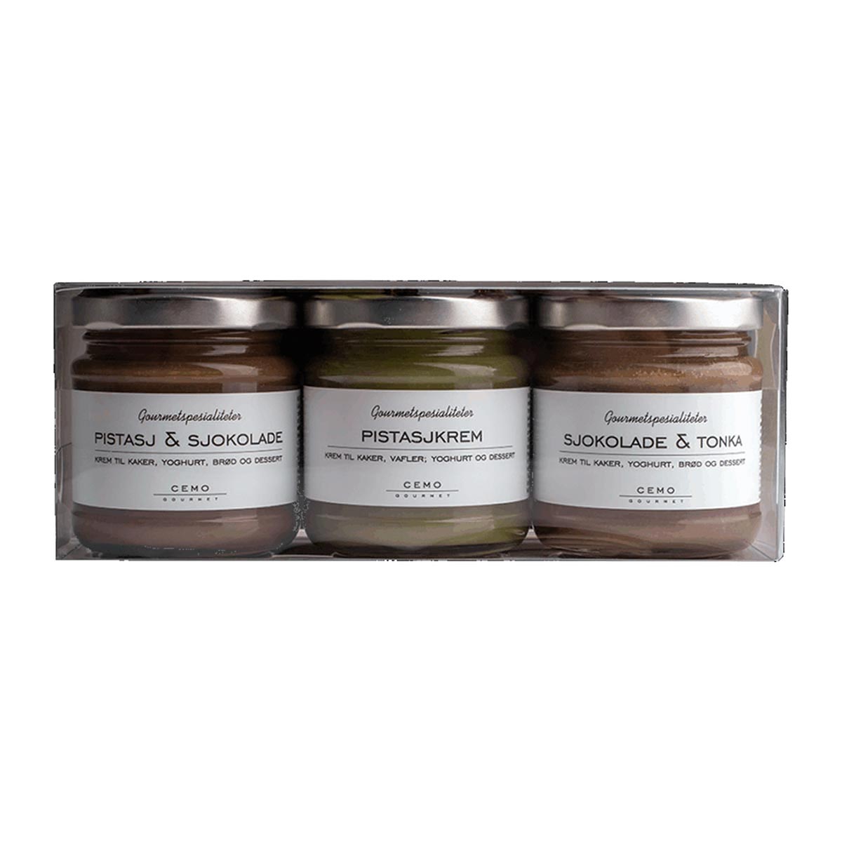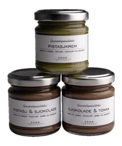 Våre Dessertdrømmer inneholder tre nydelige kremer: Pistasj- og sjokoladekrem, Pistasjkrem og Sjokolade- og tonkakrem. Bruk dem i bakst, til desserter, som saus over is, eller på en ristet brødskive for litt ekstra luksus i hverdagen. Nydelige smaker laget for å inspirere og gi ekte matglede.