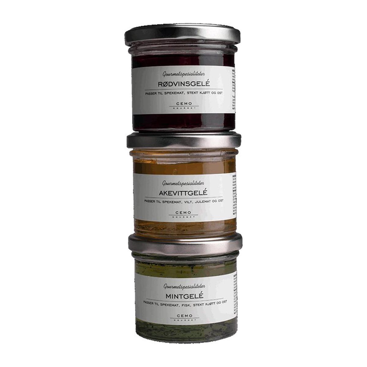 Eske med tre deilige gourmetgeleer. Her får du Mintgele, Rødvinsgele og Akevittgele.