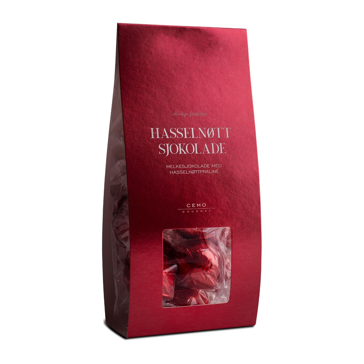 Melkesjokoladekuler fylt med deilig hasselnøttpraliné. Sjokoladekulene er pakket i skinnende rød folie og er svært dekorative i sjokoladeskålen.