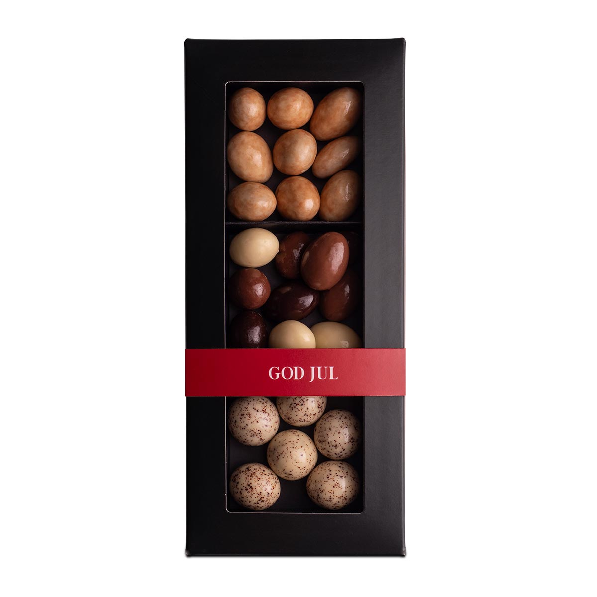 Klassikeren sjokolademandler er drasjert med yoghurtsjokolade, melkesjokolade og mørk sjokolade.