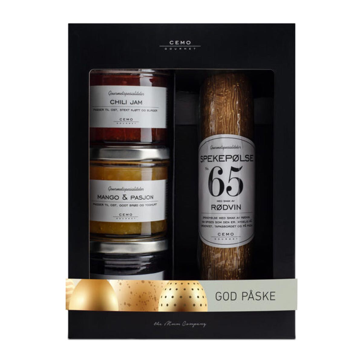 Gavesett med Spekepølse med rødvin, Solbærgelé, Mango-og pasjon jam og Chilijam.