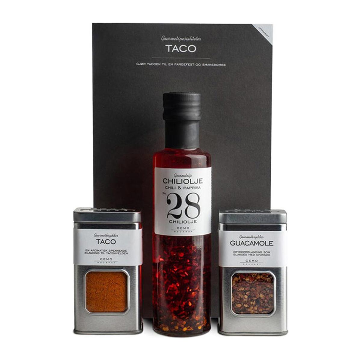 Cellofanposen inneholder Tacokrydder, Chiliolje, Guacamolekrydder og oppskrifter på spennende tacotilbehør.