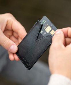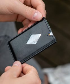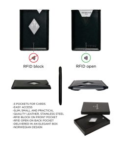 - Kortholderen inneholder en innebygd RFID blokkerende nylon under skinnet i front kortlomme, som beskytter kortet ditt mot elektronisk tyveri
