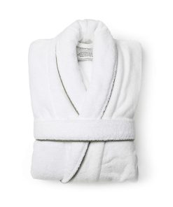 Luksuriøs badekåpe av 100 % bomull. Kåpen er en klassisk modell med ekstra bred krage og belte rundt livet. Den har også flere fine detaljer, deriblant lukkede sømmer og kontrasterende pyntelinjer på kragen. Laget av lange bomullsfibre med ikke-tvinnede tråder. Resultatet er en utrolig myk badekåpe som du ikke ønsker å ta av deg igjen.