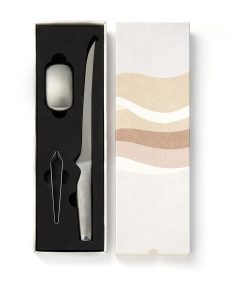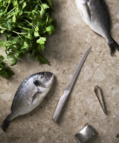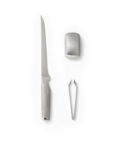 Filetkniv laget av høykvalitets japansk 420J stål. Filetkniven har et langt, tynt og fleksibelt blad – perfekt for presise kutt. Du kan bruke kniven til for eksempel å filetere fisk eller skjære skinke. Settet kommer med metallsåpe som fjerner lukter som fisk og hvitløk. Esken inneholder også en pinsett for å fjerne små bein fra fisk. Den perfekte gaven til matlagingsentusiaster.