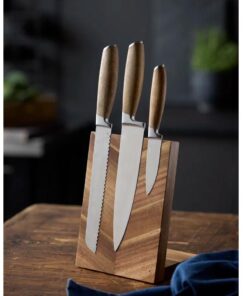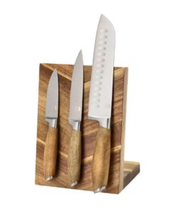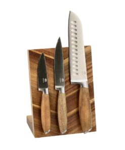 Vakker magnetisk knivblokk i akasietre med fiskebensmønster. Den tunge basen sørger for at blokken står stødig og trygt på bordet. Knivblokken har dobbel lagringsplass, siden knivene kan plasseres på begge sider av blokken. Tredelen av varen er FSC®-sertifisert akasie (FSC-C166612).