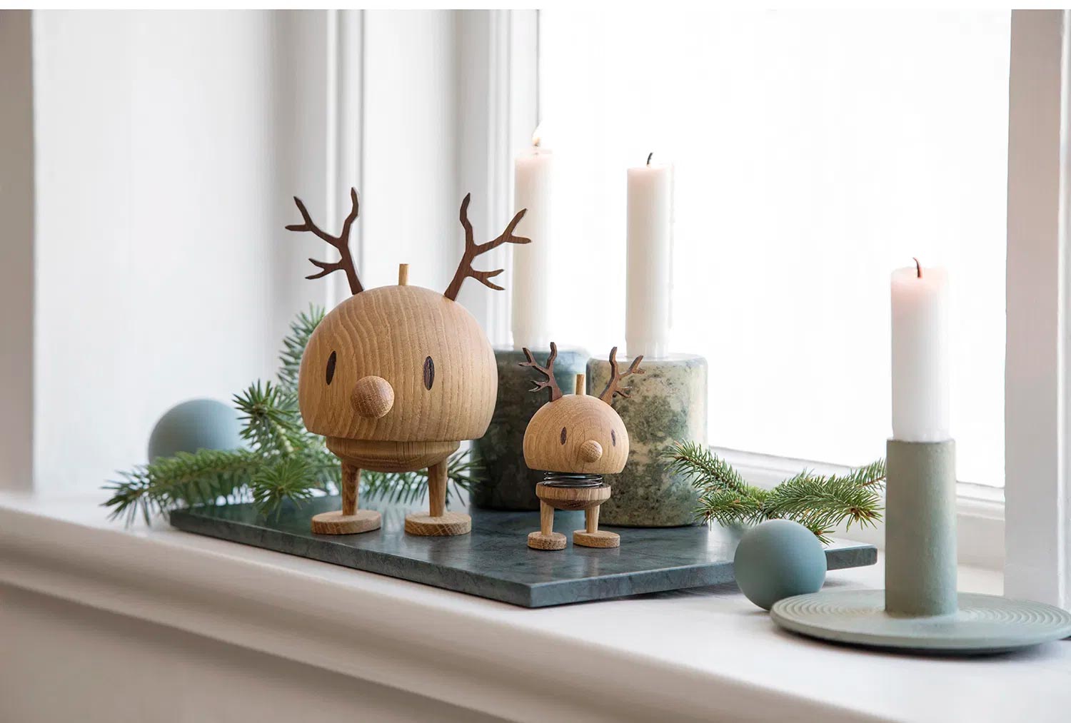 Julen er smilenes fest, og våre muntre reinsdyr av eik får smilene til å spre seg i den glade høytiden. De er naturlig julepynt, men geviret kan tas av, så Hoptimisten kan fint stå i hyllen hele året. Varen er produsert av FSC®-sertifisert eik (FSC-C166612). H 9,5 cm, D 5,9 cm Med en sterk tro på smilets kraft skapte Gustav Ehrenreich den glade Hoptimistbevegelsen på slutten av 1960-tallet. Målet var å skape en figur som var en evig påminnelse om å være positiv og optimistisk. For selv om 1960-tallet ofte blir kalt «De glade 60-årene», var tiåret preget av uroligheter. Derfor var Ehrenreichs design en kjærkommen gledesspreder i en ellers turbulent tid. Bimble og Bumble representerer de første Hoptimistene fra designerens hånd: En jente med smilende øyne, kledd i kjole, og en oppmerksom gutt med spiss på hodet. I dag er de glade Hoptimistene en del av dansk designhistorie, og de sprer glede rundt om i hele verden.