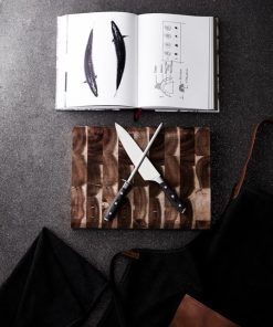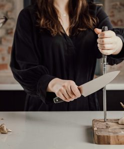 Kokkekniv og knivsliper/skjerpestål fra Kaiser-serien. Denne knivserien har tatt flere år å utvikle seg. Stålet er nøye utvalgt fra Tyskland, X50CrMoV15 og håndtaket er av Pakkaträ. Håndtaket er lett å gripe, som sammen med sin velbalanserte kropp fra ende til egg gjør det mer komfortabelt og lettere å jobbe med. De gode egenskapene til det tyske stålet betyr at bladene både er flekkbestandige og ikke krever høye vedlikeholdskrav mer enn sliping. Dens skarphet varer lenge, og når du trenger å male det, er det en enkel oppgave.