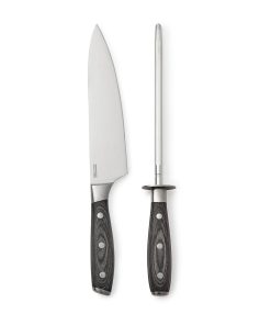 Størrelse: Kokkekniv: 33 cm (blad: 20 cm), skjerpestål: 33 cm.