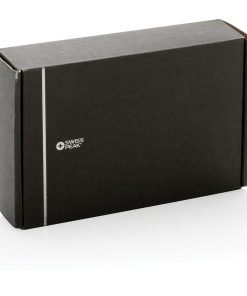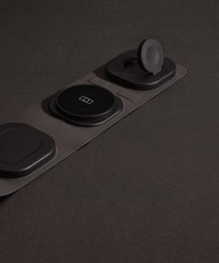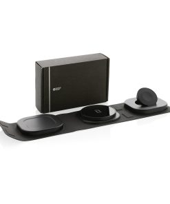 Luksuriøs og sammenleggbar 3-i-1 trådløs lader laget av RCS resirkulert ABS Totalt resirkulert innhold: 38 % basert på totalvekt av produktet. RCS-sertifisering sikrer en fullstendig sertifisert forsyningskjede for de resirkulerte materialene. Den trådløse laderen er utstyrt med en magnetisk 15 W trådløs lader og en ekstra 5 W trådløs lader som er egnet for ørepropper eller andre små trådløse ladbare enheter og en 2,5 W trådløs lader for smartklokker (kun Apple-klokker) Inkludert RCS-sertifisert 120 cm resirkulert TPE-kabel og pakket i FSC® mix kraft-emballasje.