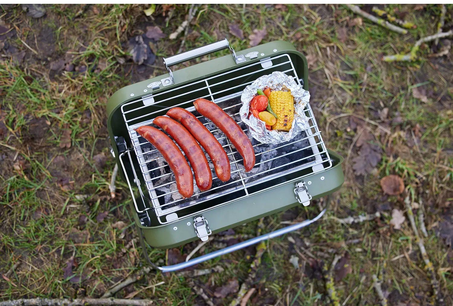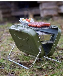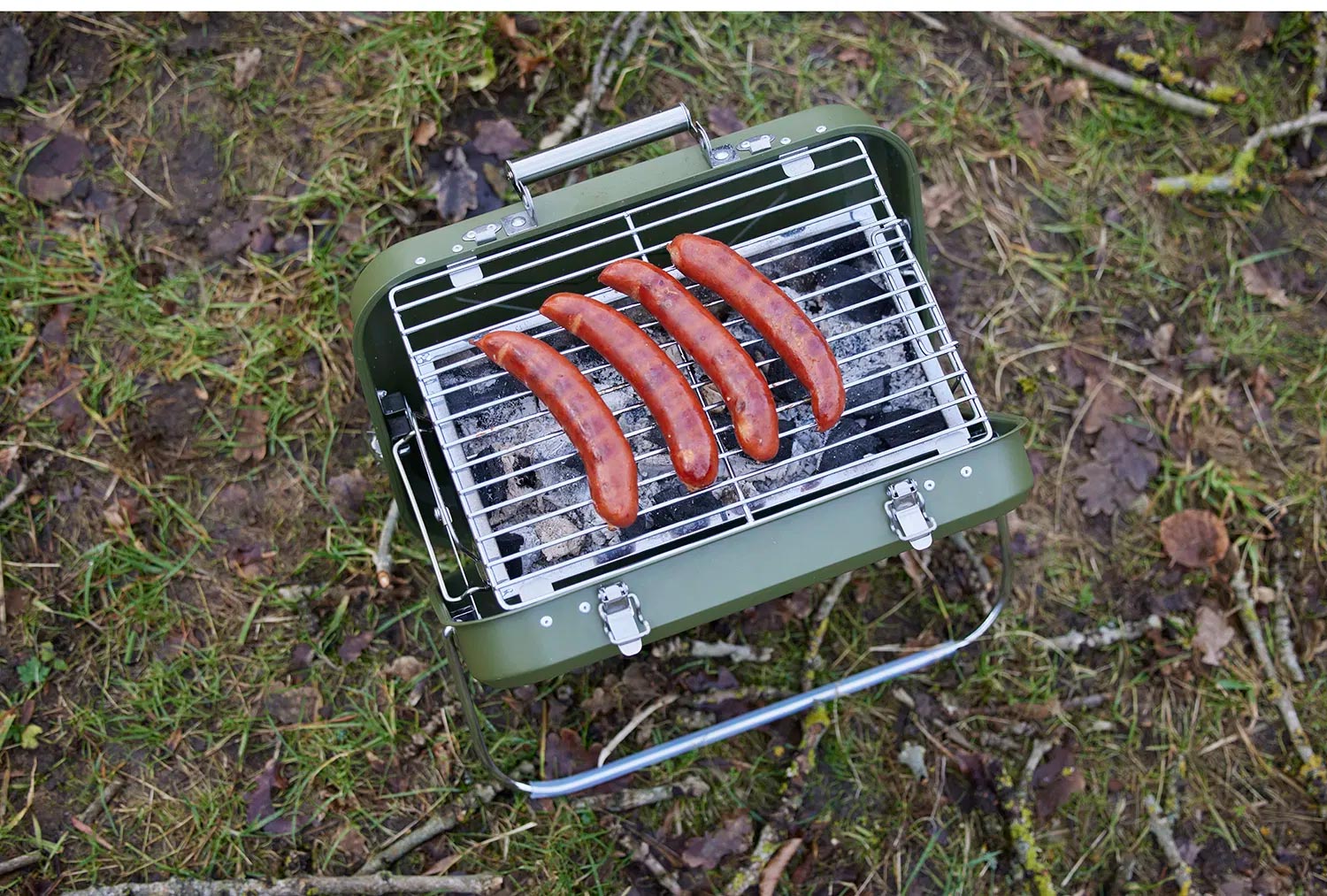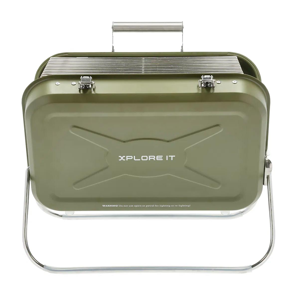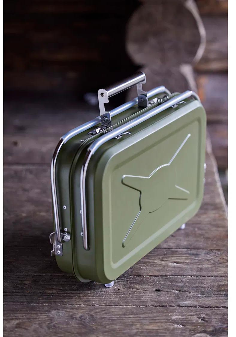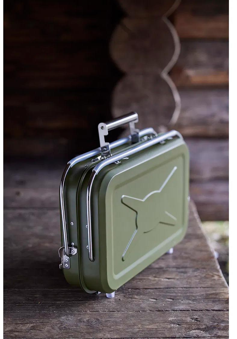 Praktisk koffertgrill med grillrist, kullrist og dryppbrett. 40 x 31,5 x 32 cm. Rustfritt stål, army.