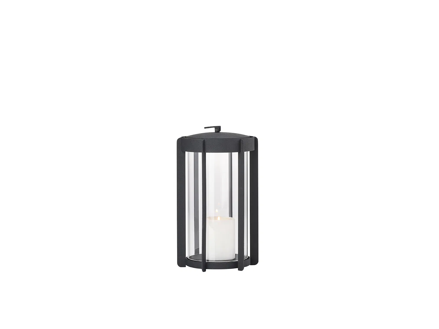 Firefly-lanternene med glassider finnes i to høyder, hhv. 25 og 35 cm og er utført i pulverlakkert stål. Toppen er lett å løfte av når et nytt lys skal settes inn. Du vipper bare den lille silikonstroppen opp, og legger den ned igjen når lyset er byttet ut. Det er noe tidløst over uttrykket, og designinspirasjonen er da også hentet flere hundre år tilbake, hvor datidens voktere gikk med lanterner gjennom byene. Her er en moderne versjon som er klar til å kaste koselys på terrasser og balkonger når skumringen melder seg. Dia 15,3 x 25 cm.